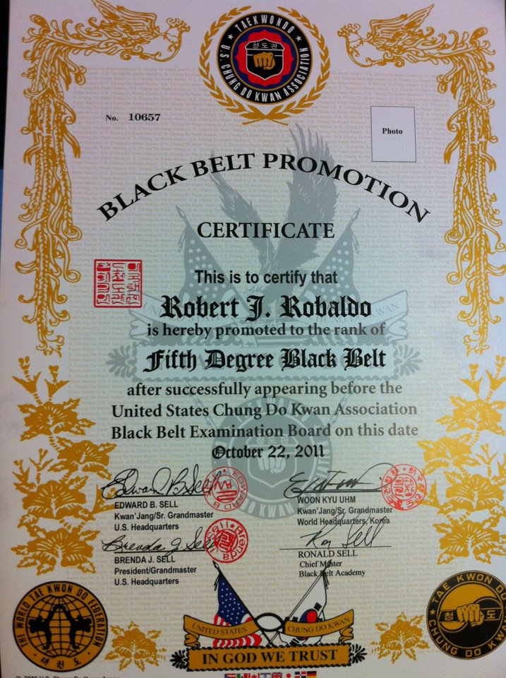 I am a 5th Degree BLACK BELT in Chung Do Kwan Tae Kwon Do.